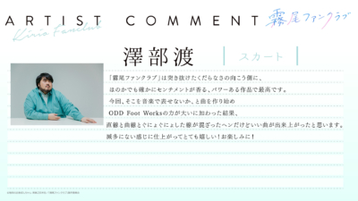 澤部渡のソロプロジェクト・スカートと、音楽グループ・ODD Foot Worksによる特別ユニット“スカートとODD Foot Works”の新曲「FANCLUB」が、TVアニメ『霧尾ファンクラブ』のオープニングテーマに決定した。本作のために書き下ろされた楽曲となる。